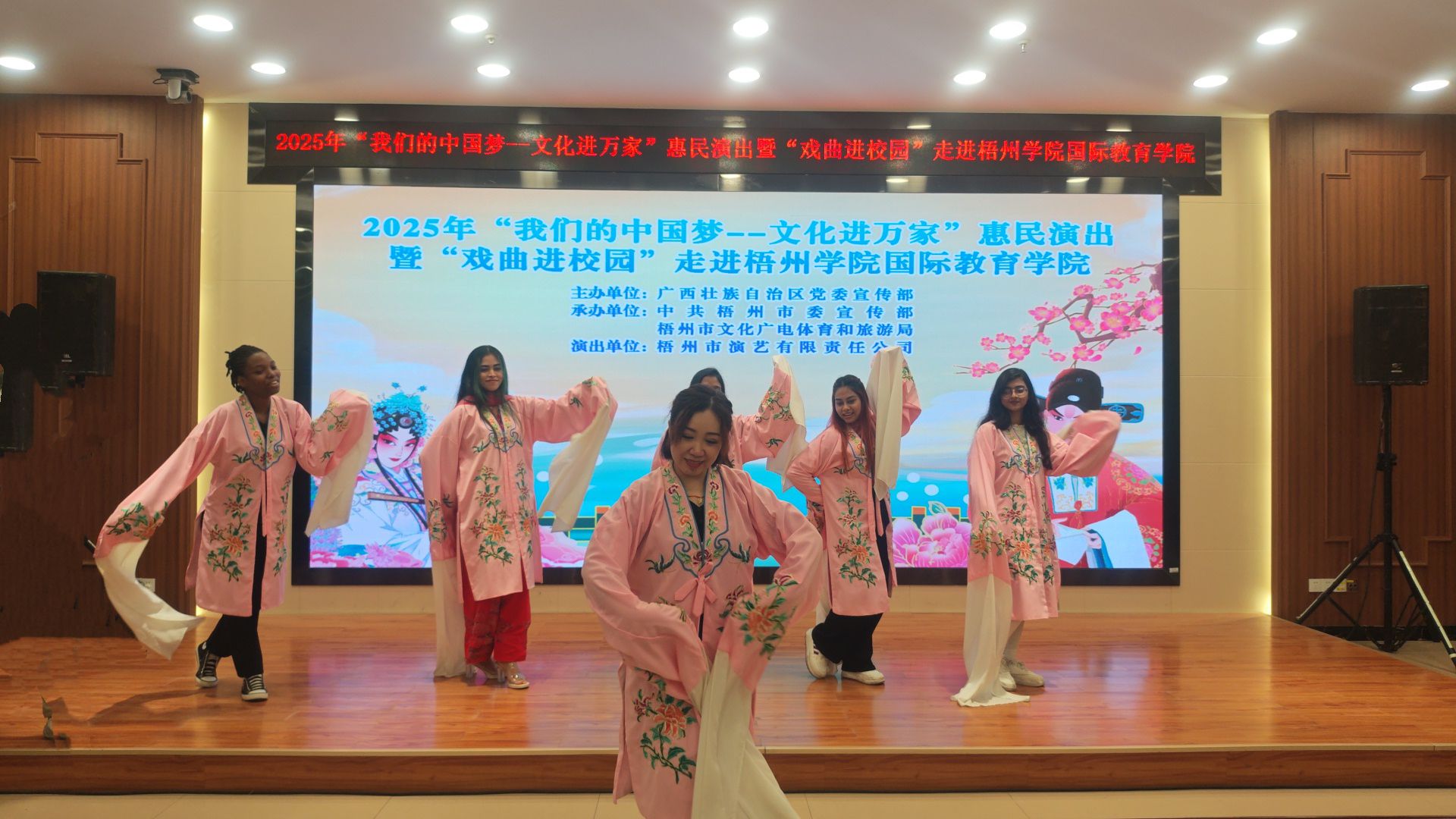 ——2025年“我们的中国梦——文化进万家”惠民演出走进梧州学院国际教育学院为丰富校园文化生活,增进国际学生对中国传统戏曲艺术的了解与体验,2025年12月8日晚,由广西壮族自治区党委宣传部主办,梧州市委宣传部、市文化广电体育和旅游局承办,梧州市演艺有限公司演出的“我们的中国梦——文化进万家”惠民演出暨“戏曲进校园”活动,在梧州学院明科楼一楼报告厅精彩上演。现场吸引了150余名国际学生齐聚一堂,共同感受中华戏曲的独特魅力。...