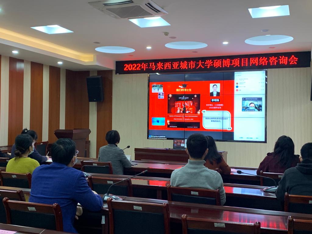 为加深我校教师对海外攻读硕博学位项目的了解,解答教师关于攻读学位的疑问,4月20日上午,我校国际交流处与国际教育学院、马来西亚城市大学国际招生办事处联合举办了“马来西亚城市大学硕博项目线上咨询会”。咨询会上,两校通过播放宣传片介绍了各自学校的基本情况。随后,马来西亚研究院院长朱伟明教授、国际招生办事处主管池健义老师就城市大学硕博项目的优势、专业、报读条件、报名需准备的材料以及相关费用等方面进行了详细介绍,...