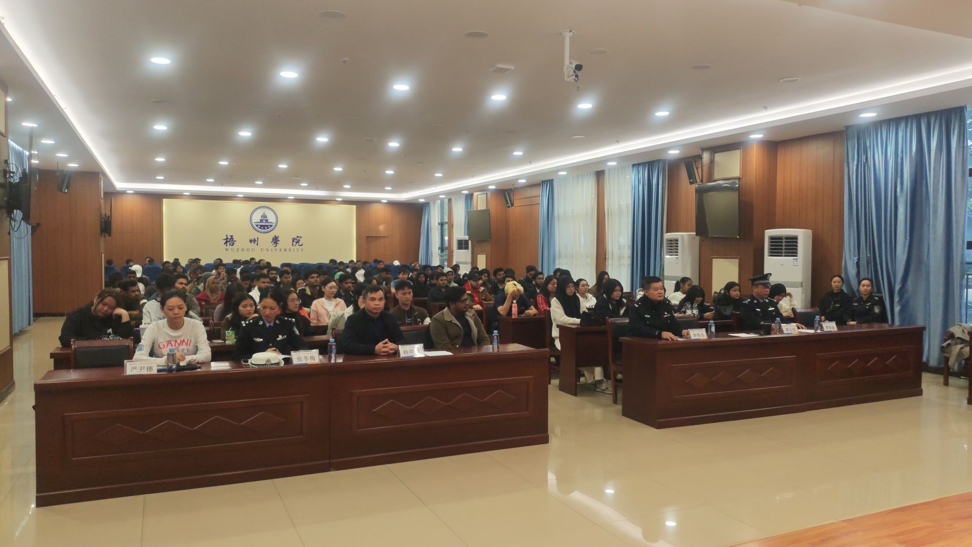 为帮助国际学生增强法律与安全意识,更好地适应在华学习和生活,2025年11月27日,梧州学院国际教育学院联合梧州市公安局出入境管理支队、交警支队万秀大队及万秀分局,共同举办了"知法守法 平安留学"法治安全教育专题讲座。100余名秋季学期入学的国际学生参加活动。